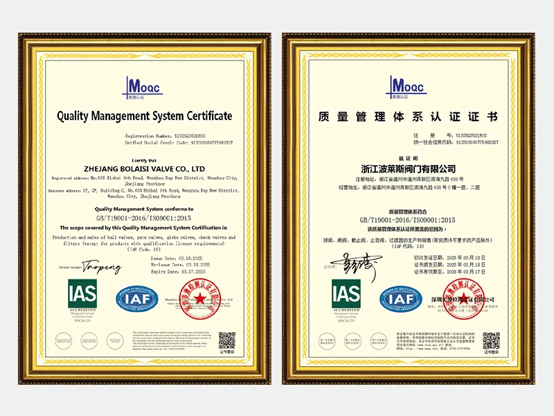 Zhejiang Bolaisi Valve Co., Ltd. è impegnata nel settore delle valvole da oltre 20 anni. La società è stata ufficialmente registrata e fondata nel 2013. Dopo più di dieci anni di sviluppo, le esigenze commerciali di Bolaisi Valve sono in costante aumento. Per soddisfare queste crescenti richieste, nel 2025 l'azienda ha fondato una società commerciale di importazione ed esportazione. I prodotti principali dell'azienda includonovalvola a saracinescas, valvole a globo, valvole di ritegno, valvole a sfera, valvole a farfallae filtri. Nel corso del suo sviluppo, l'azienda ha ricevuto un forte sostegno da tutti i settori della società e dai suoi clienti. Di fronte alle sfide future, l'azienda adotterà una filosofia aziendale completamente nuova, coltiverà attentamente una cultura aziendale unica e si dedicherà a fornire ai clienti nazionali e internazionali soluzioni più pratiche, migliore reputazione, prodotti di qualità superiore e servizi più completi. Aderiamo sempre ai principi aziendali di "perseguire l'eccellenza senza limiti" e "tutto per il cliente". Diamo sinceramente il benvenuto a vecchi e nuovi clienti nazionali e internazionali che desiderano visitare la nostra azienda per ricevere assistenza e cooperazione basata sui principi di "alta qualità e prezzo ragionevole, vantaggi complementari e vantaggio reciproco". Bolaisi Valve è disposta a lavorare fianco a fianco con te, crescere insieme e creare un futuro brillante!